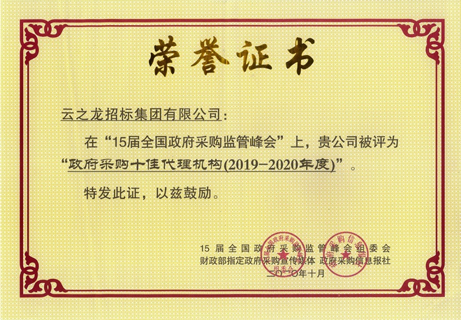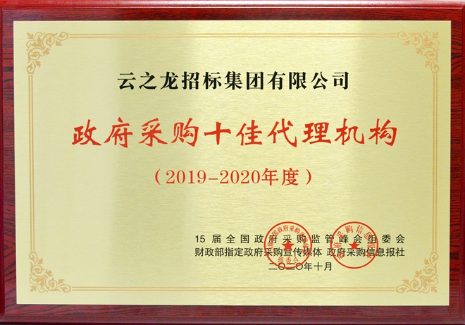 【喜訊】熱烈祝賀云之龍集團(tuán)榮獲“全國(guó)政府采購(gòu)十佳代理機(jī)構(gòu)(2019-2020年度)”稱號(hào)