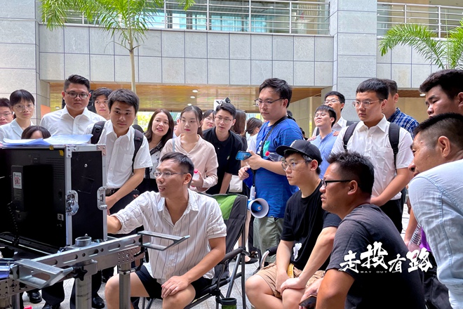 導(dǎo)演給群演們回看剛拍攝的鏡頭。