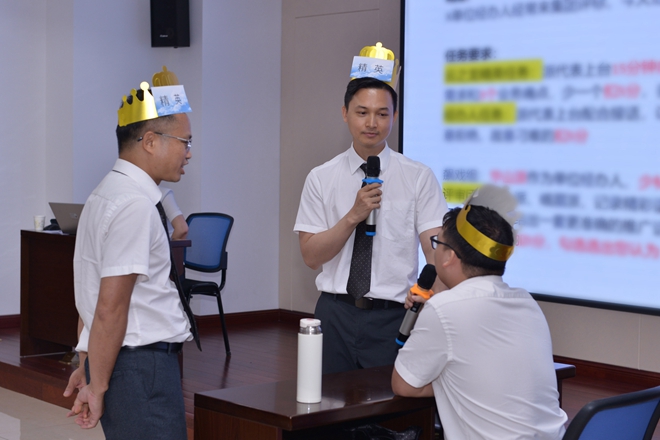 聶總精心策劃組織了專業話術情景模擬演練PK賽,將現場學員分為“昆侖”“峨眉”“少林”“華山”4個組別。通過4個最有可能接觸客戶的場景,讓學員現場模擬日常與客戶溝通交流的過程。演練結束后,學員當場歸納總結在演練中表現出的精彩語錄和溝通技巧。通過學習及練習,最后總結沉淀經驗,讓學員們身臨其境,印象深刻,收獲頗多。