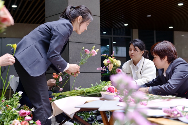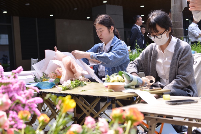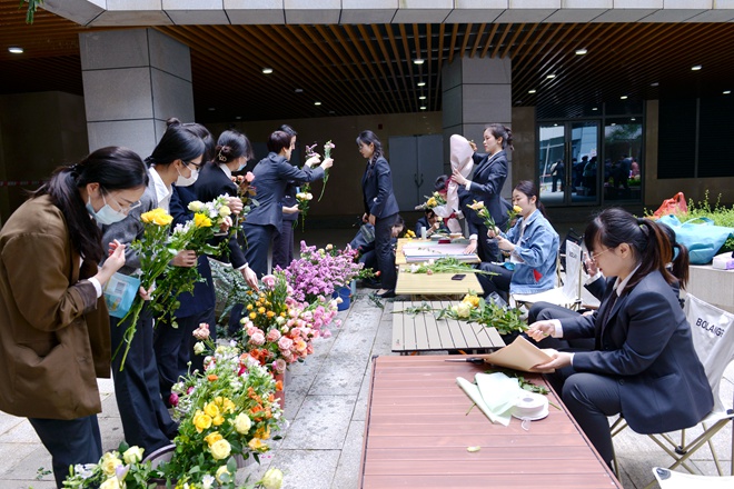 為自己包一束美麗的花,是這個(gè)節(jié)日最好的禮物。DIY花束前也圍滿了女職工,大家挑選自己喜歡的鮮花,巧手修枝剪葉,巧妙地創(chuàng)意組合,包扎出一束束錯(cuò)落有致、色彩鮮艷的花束,寄托著大家對(duì)美的理解和對(duì)幸福的感悟。