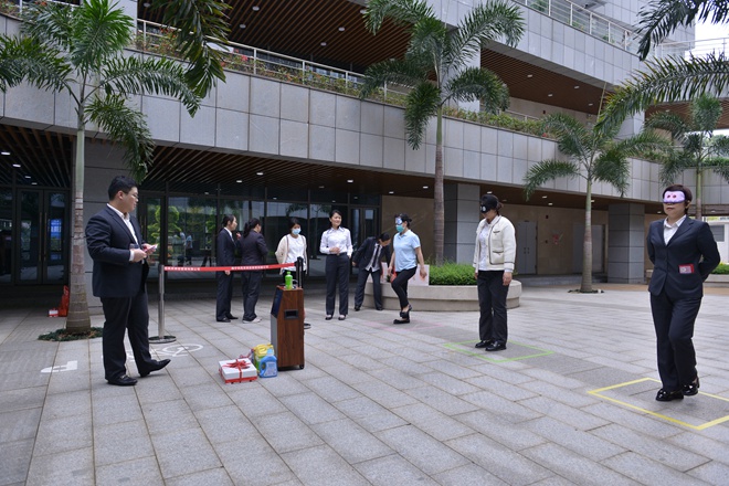 “原地踏步走”需要參與者在方框內(nèi),蒙眼行走30秒,不走出方框的,則可以獲得一張獎(jiǎng)券。一開始,參與者們都信心滿滿,走著走著就偏離了方向,惹得“圍觀群眾”哈哈大笑。