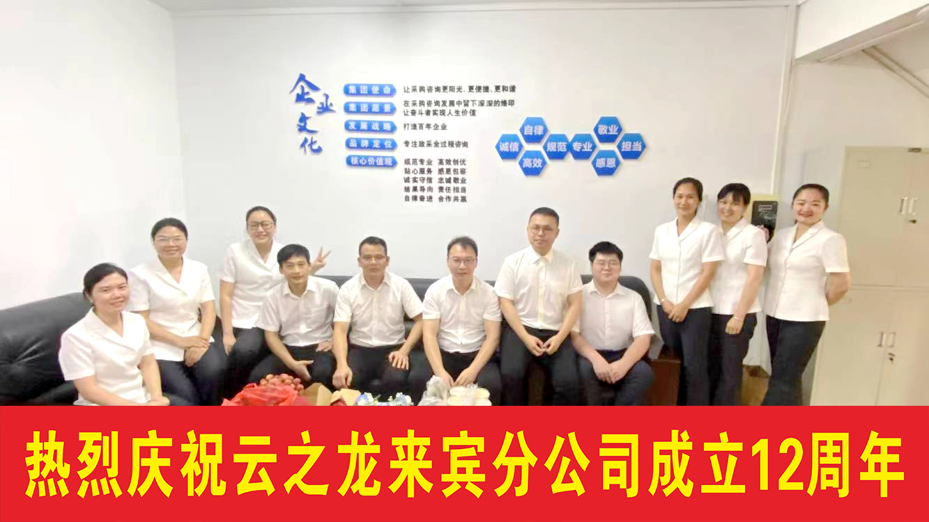 來賓分公司是云之龍咨詢集團直屬分公司,12年來緊跟時代步伐,與時俱進,不斷提升自身的業(yè)務技能,提高服務水平,在業(yè)界創(chuàng)下了良好口碑,贏得廣大客戶的高度肯定,為來賓市政府采購事業(yè)作出積極貢獻。
