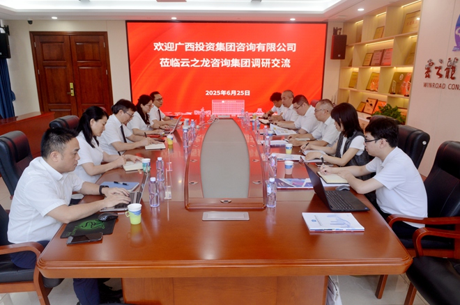 2025年6月25日,廣西投資集團咨詢有限公司(以下簡稱“廣投咨詢”)副總經理陳弘志率隊到云之龍咨詢集團調研交流。云之龍副總裁莫國華等管理者參加交流會議。雙方在交流中碰撞思想火花,共同探討咨詢發展新路徑。