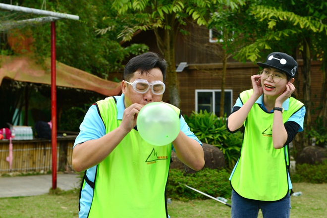 在接力障礙賽環節中,團隊分成兩組,在擠壓板上完成雙人跳繩、跳馬、吹爆氣球等一系列熔煉團隊精神的游戲。在游戲中,大家相互配合、攜手合作,在成功時歡呼喝彩,在遇到困難時集思廣益。